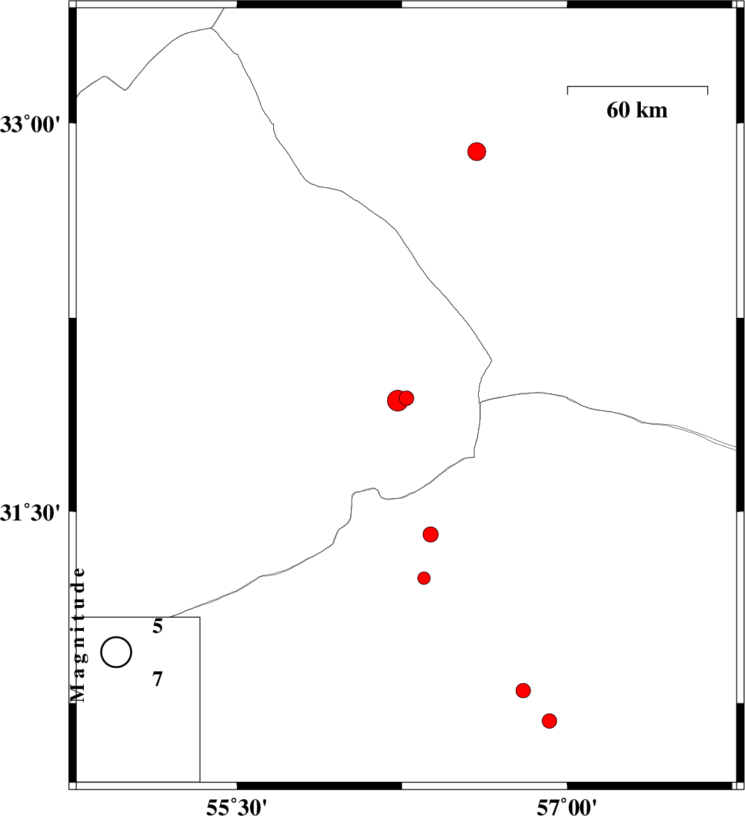 2009/01/24 | 05:50:33.4 | 09:20:33.4 | 32.89 | 56.59 | 14 | ML3.6 | 84 km South-West of Tabas, Yazd Province | ||
