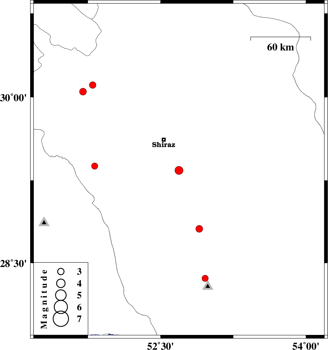 2009/02/09 | 10:34:41.5 | 14:04:41.5 | 29.34 | 52.69 | 42 | ML3.8 | 35 km South-East of Shiraz, Fars Province | ||