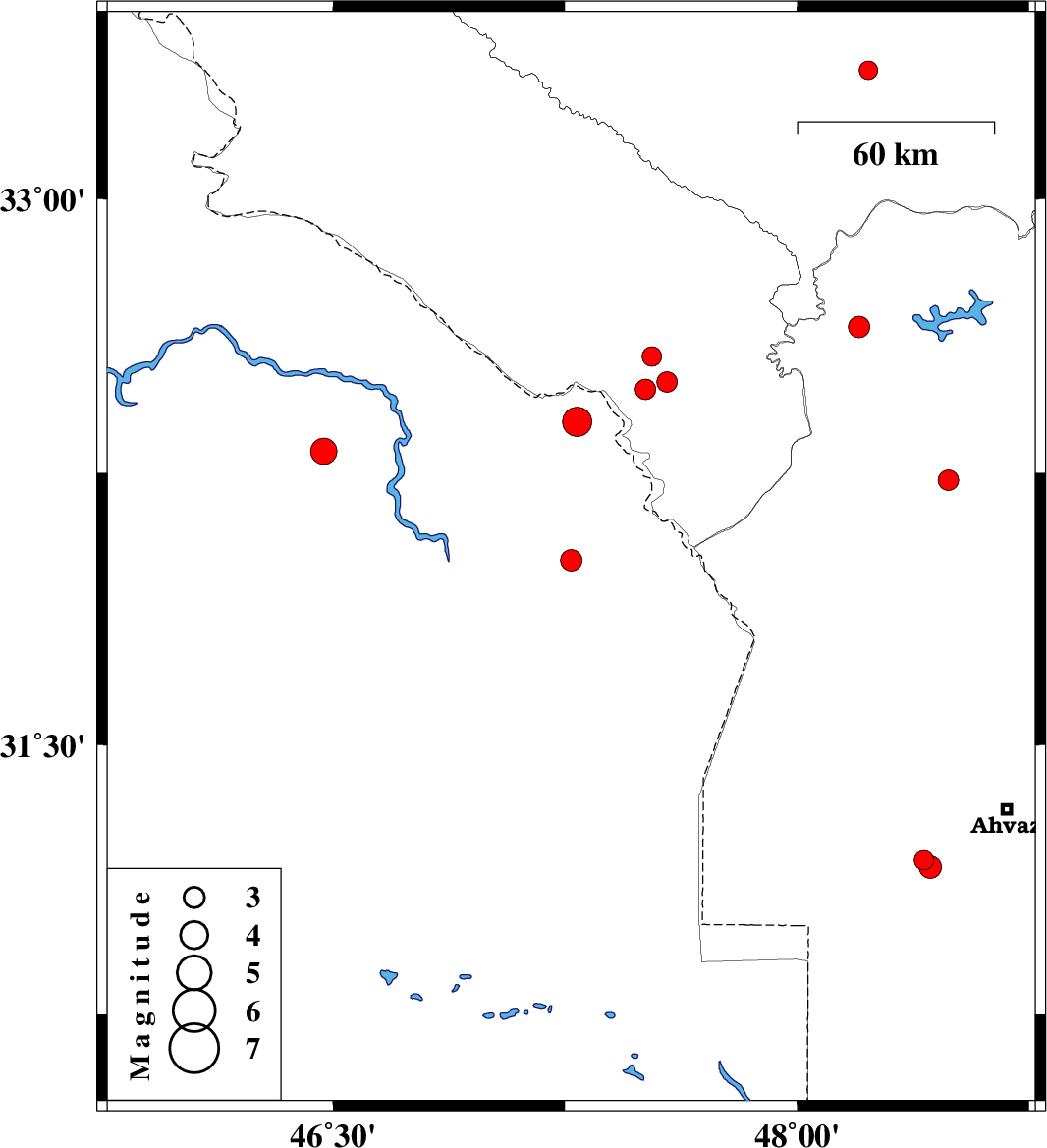 2009/02/07 | 10:31:09.3 | 14:01:09.3 | 31.16 | 48.43 | 30 | ML3.2 | 29 km South-West of Ahvaz, Khoozestan Province | ||