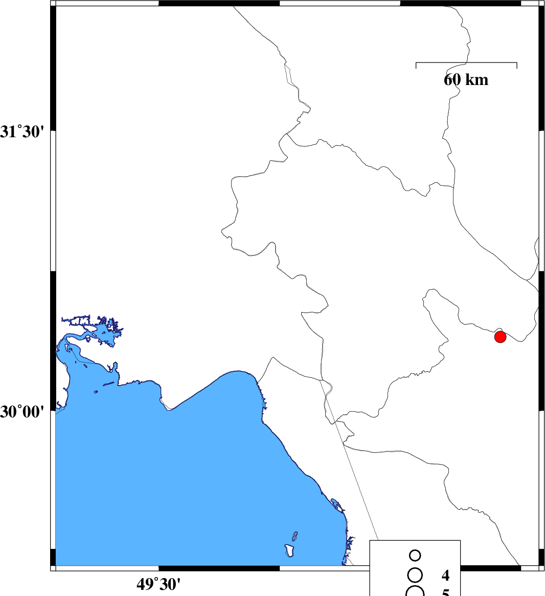 2009/02/12 | 00:54:52.4 | 04:24:52.4 | 30.91 | 49.67 | 45 | ML3.2 | 17 km North of Omidiyeh, Khoozestan Province | ||