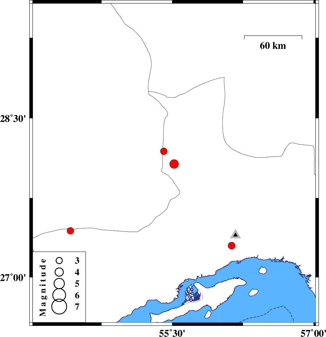 2009/02/22 | 20:54:01.3 | 00:24:01.3 | 28.07 | 55.52 | 14 | ML4.2 | 45 km South-West of Hajiabad, Hormozgan Province | ||