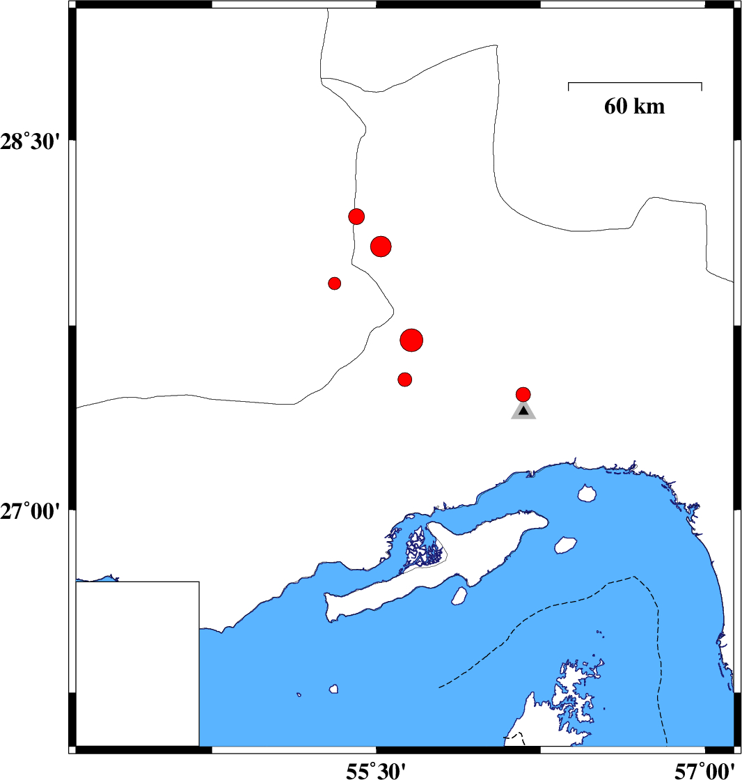 2009/02/24 | 06:31:25.8 | 10:01:25.8 | 27.53 | 55.63 | 14 | ML2.8 | 74 km North-West of Bandar-e abbas, Hormozgan Province | ||