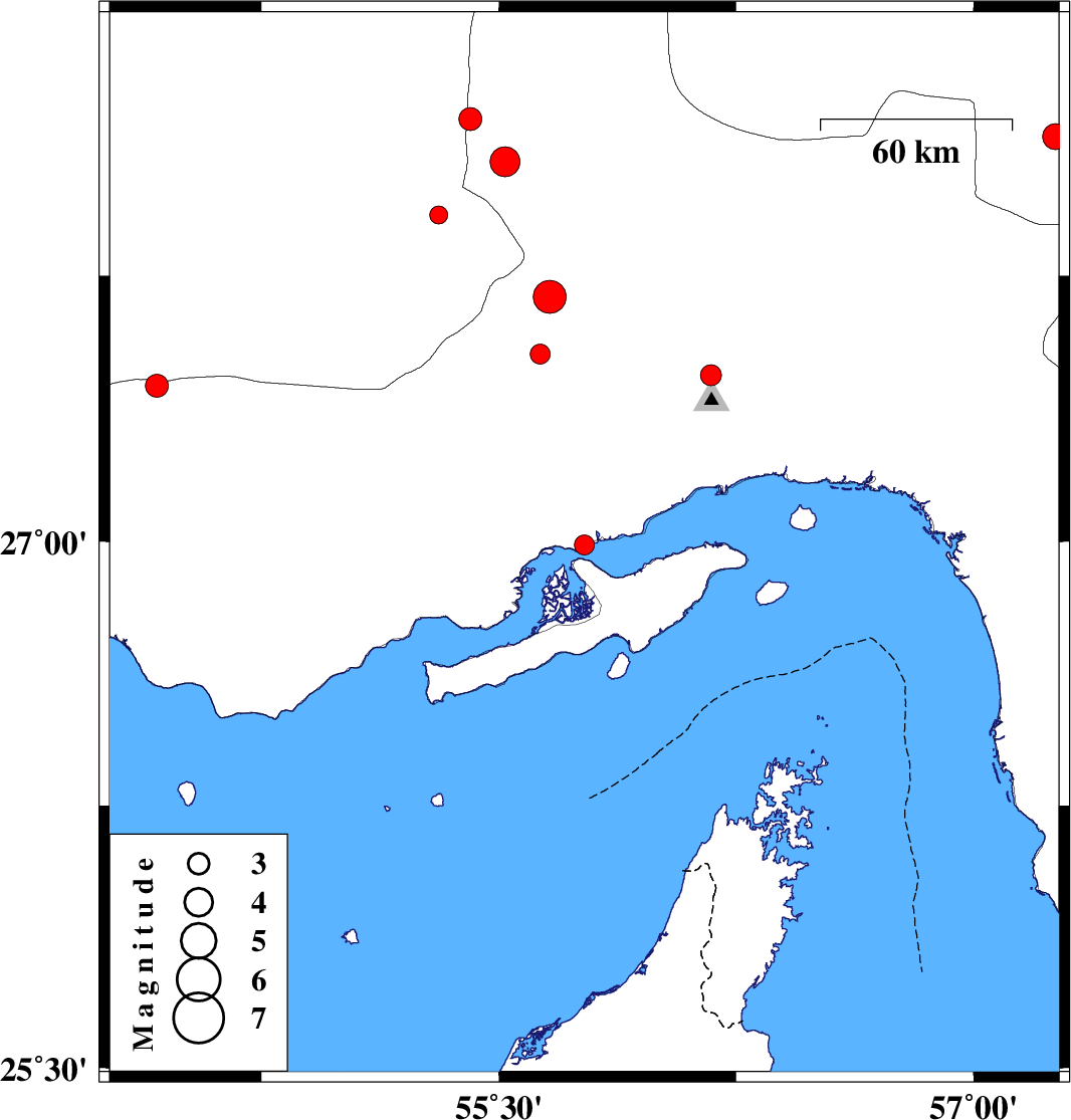 2009/02/25 | 01:13:17.0 | 04:43:17.0 | 26.99 | 55.77 | 8 | ML2.8 | Persian Gulf, 49 km West of Qeshm | ||