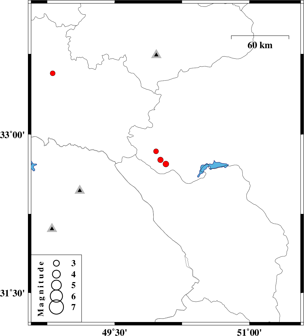 2009/03/01 00:06:49.4 03:36:49.4 32.7250.0717 ML3 24 km South of Fereydunshahr, Esfahan Province