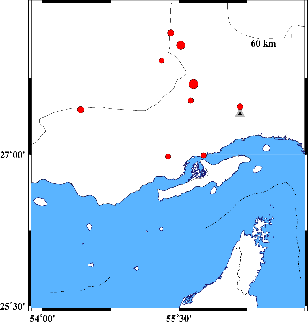 2009/02/25 | 01:13:17.0 | 04:43:17.0 | 26.99 | 55.77 | 8 | ML2.8 | Persian Gulf, 49 km West of Qeshm | ||