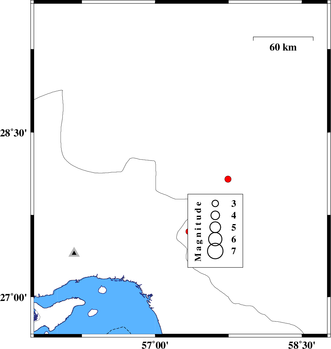 2009/03/03 | 03:59:50.8 | 07:29:50.8 | 28.16 | 57.26 | 14 | ML4.2 | 47 km North-West of Kahnuj, Kerman Province | ||