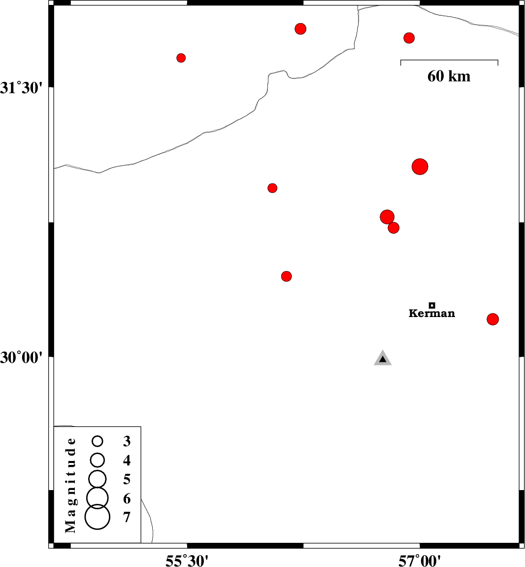 2009/02/27 | 09:19:12.7 | 12:49:12.7 | 31.77 | 56.93 | 16 | ML3.1 | 57 km North-East of Ravar, Kerman Province | ||