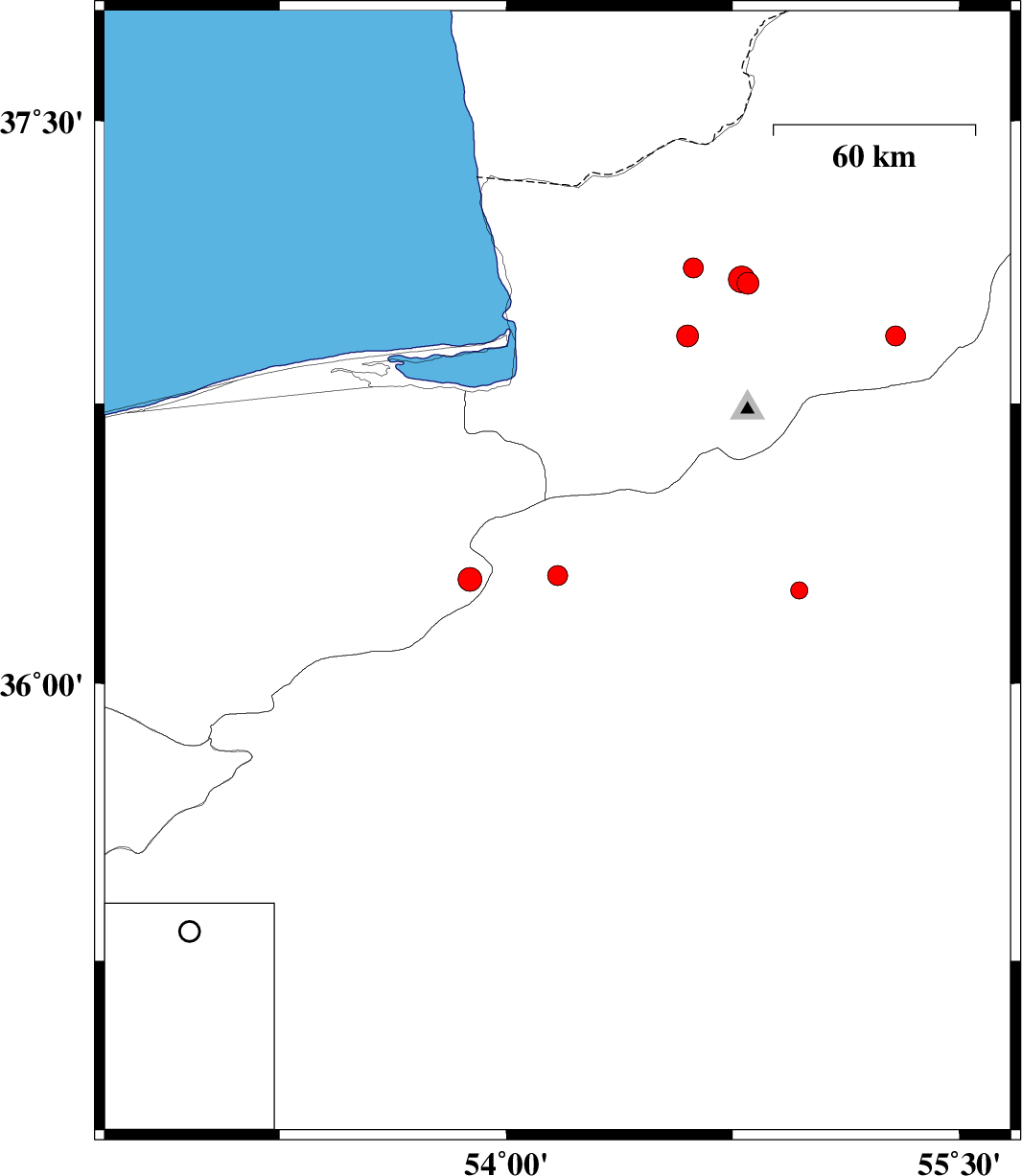 2009/02/11 | 12:46:41.6 | 16:16:41.6 | 36.93 | 54.6 | 39 | ML3.2 | 16 km East of Aq Qaleh, Golestan Province |