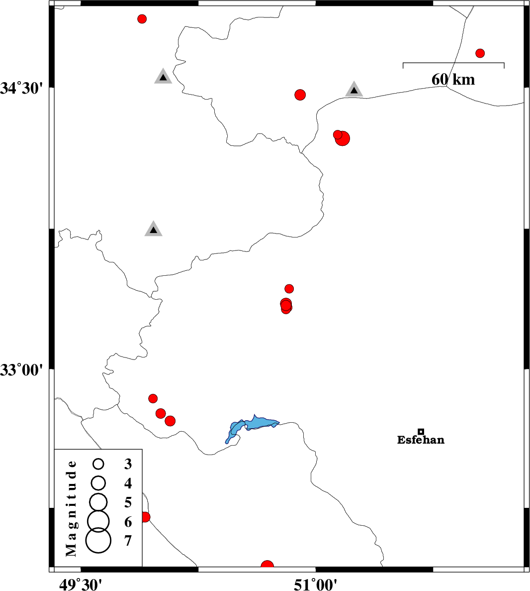 2009/03/01 | 00:06:49.4 | 03:36:49.4 | 32.72 | 50.07 | 17 | ML3 | 24 km South of Fereydunshahr, Esfahan Province | ||