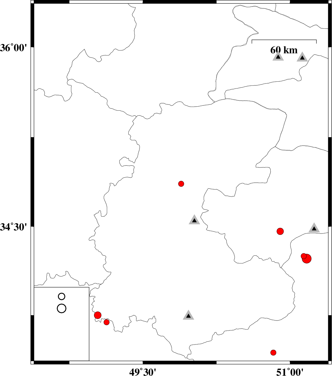2009/03/23 | 15:38:20.4 | 20:08:20.4 | 34.86 | 49.89 | 45 | ML2.5 | 22 km North-West of Tafresh, Markazi Province | ||