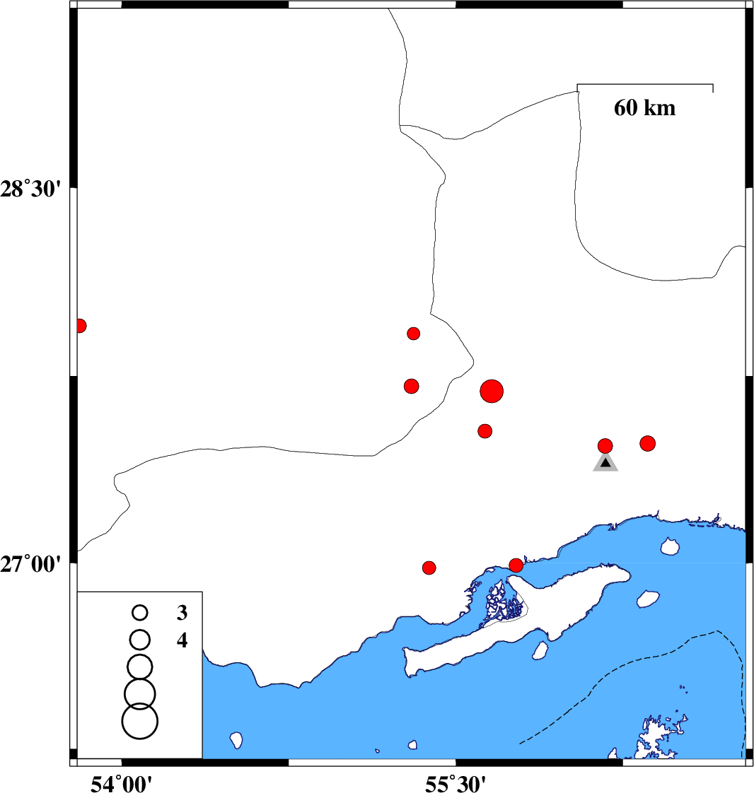 2009/02/24 | 06:31:25.8 | 10:01:25.8 | 27.53 | 55.63 | 14 | ML2.8 | 74 km North-West of Bandar-e abbas, Hormozgan Province | ||