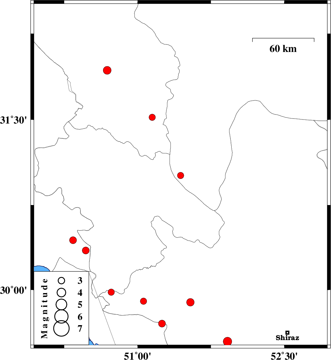 2009/03/13 | 01:28:53.1 | 04:58:53.1 | 29.9 | 51.06 | 15 | ML2.9 | 50 km South-West of Nurabad, Fars Province | ||