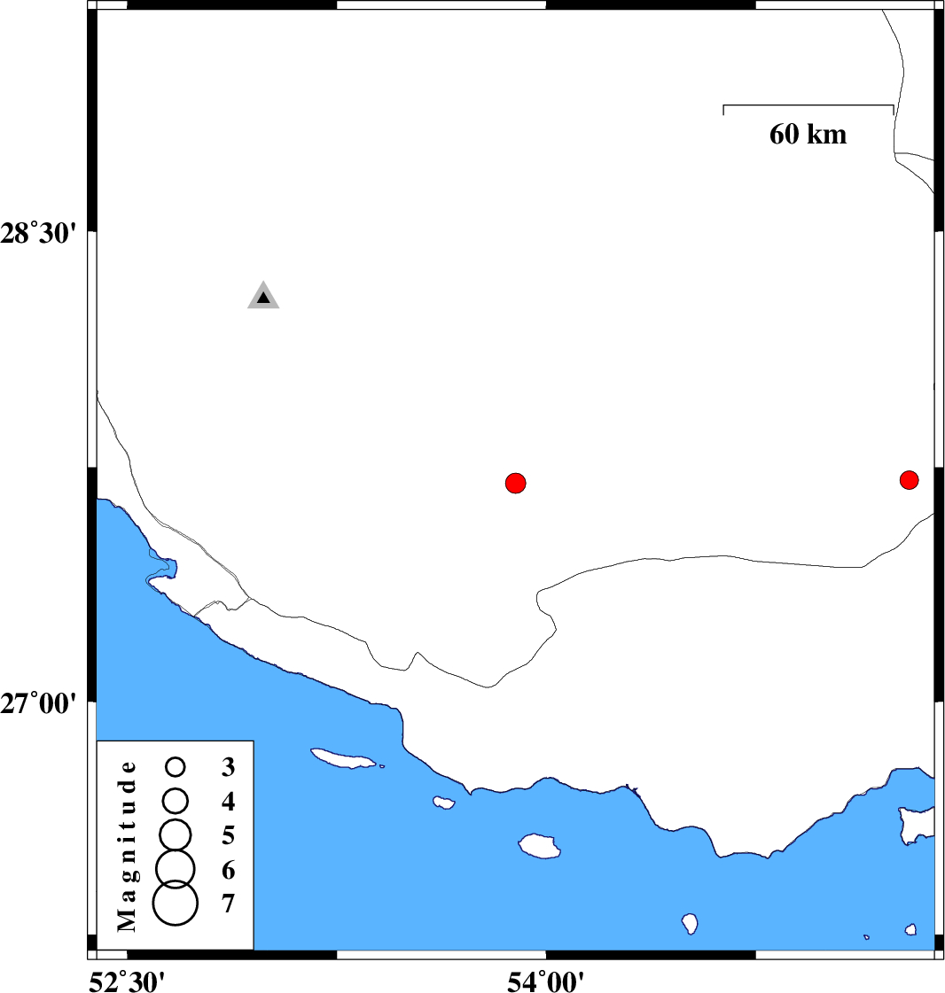 2009/04/14 | 18:33:42.2 | 23:03:42.2 | 27.7 | 53.89 | 15 | ML3.3 | 44 km West of Lar, Fars Province | ||