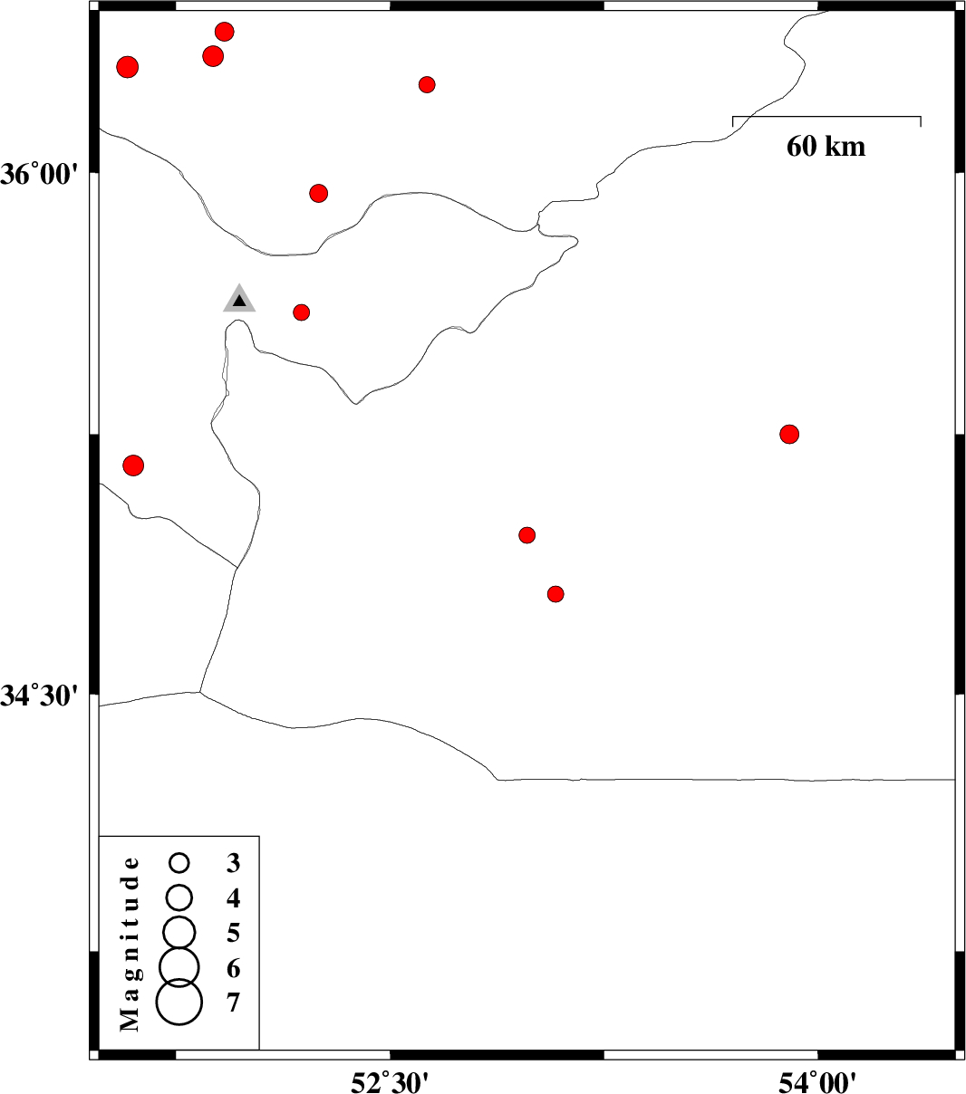 2009/04/04 | 10:18:08.8 | 14:48:08.8 | 36.33 | 51.88 | 14 | ML3.3 | 30 km South-West of Nur, Mazandaran Province | ||