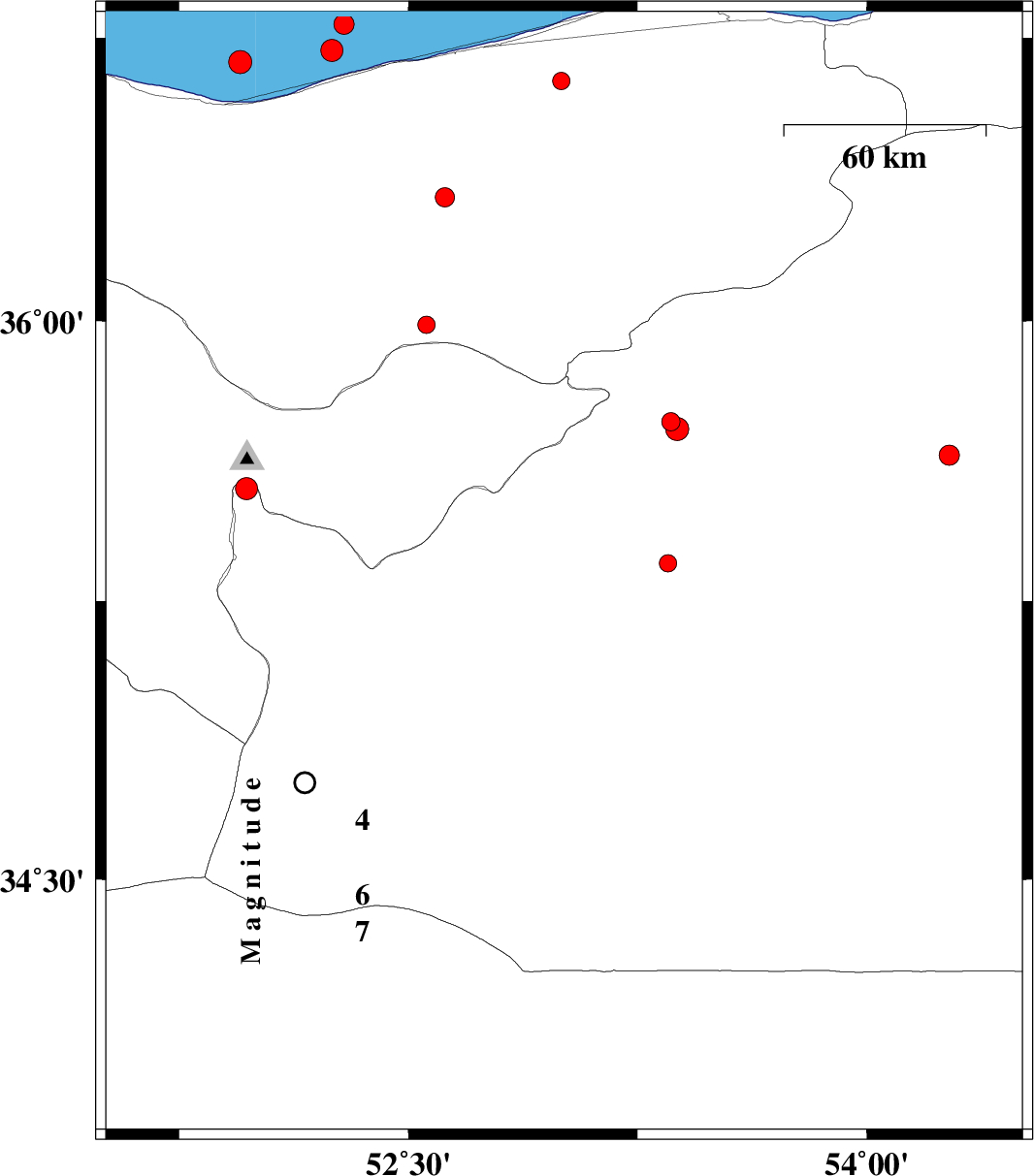 2009/04/04 | 10:18:08.8 | 14:48:08.8 | 36.33 | 51.88 | 14 | ML3.3 | 30 km South-West of Nur, Mazandaran Province | ||