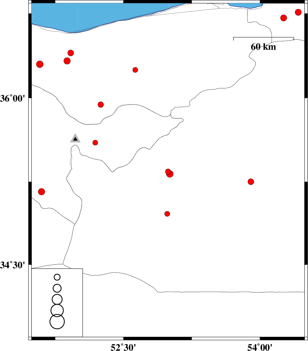 2009/04/04 | 10:18:08.8 | 14:48:08.8 | 36.33 | 51.88 | 14 | ML3.3 | 30 km South-West of Nur, Mazandaran Province | ||