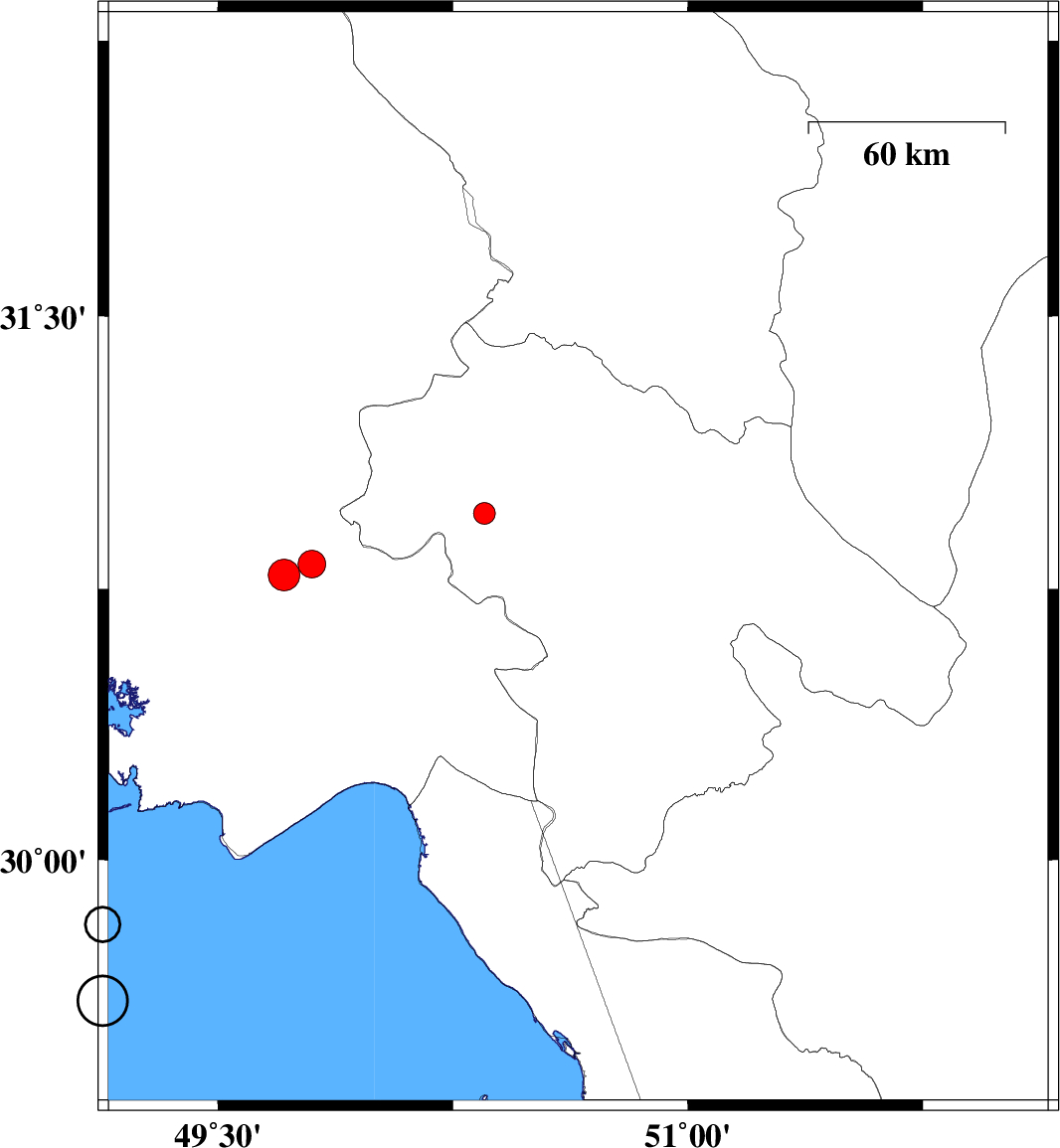 2009/04/16 | 03:02:27.3 | 07:32:27.3 | 30.69 | 50.1 | 29 | ML3.9 | 17 km West of Behbahan, Khoozestan Province | ||