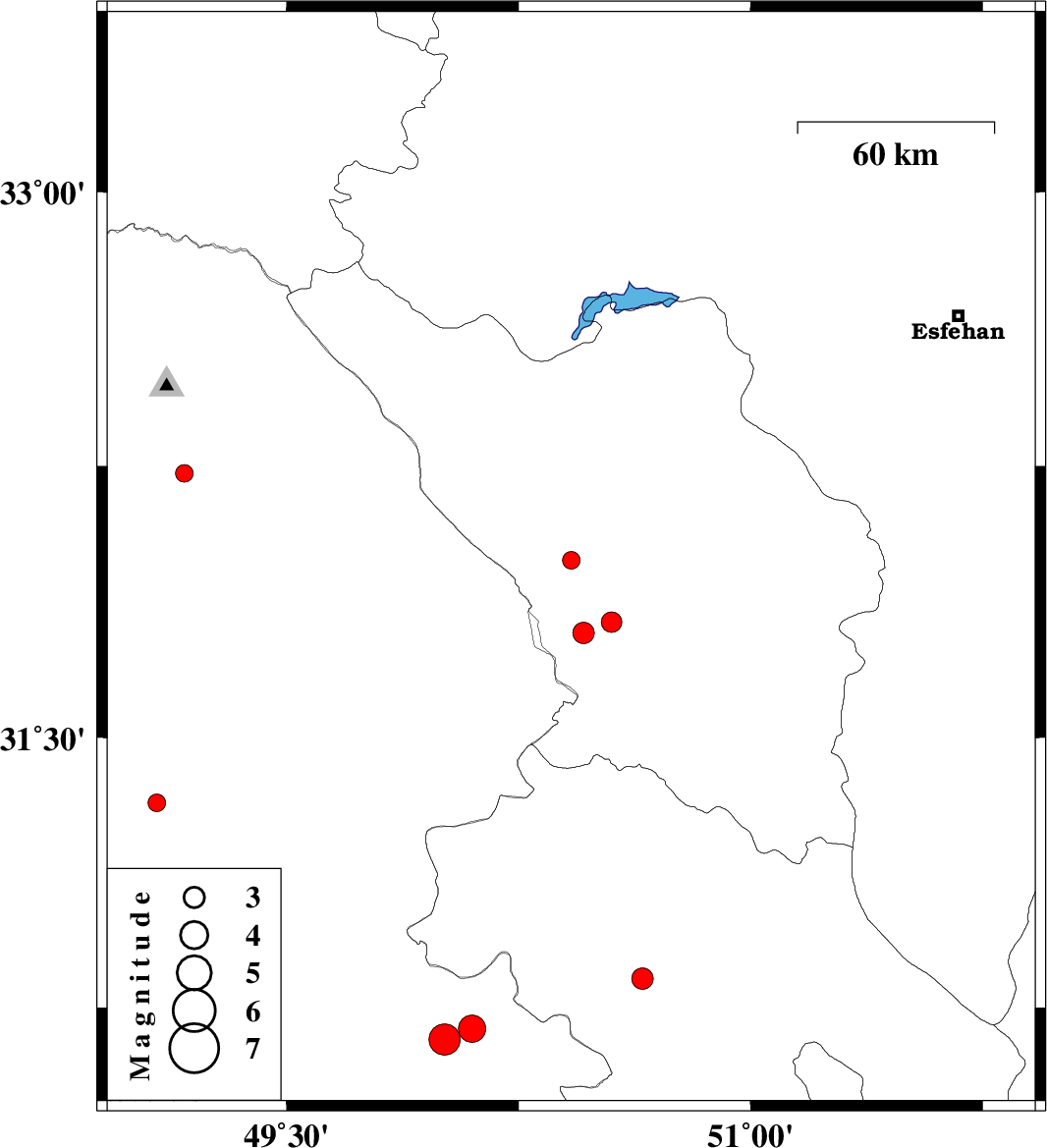 2009/04/18 | 03:24:15.7 | 07:54:15.7 | 31.79 | 50.46 | 17 | ML3.1 | 28 km South-West of Ardel, Chaharmahal Bakhtiari Province | ||
