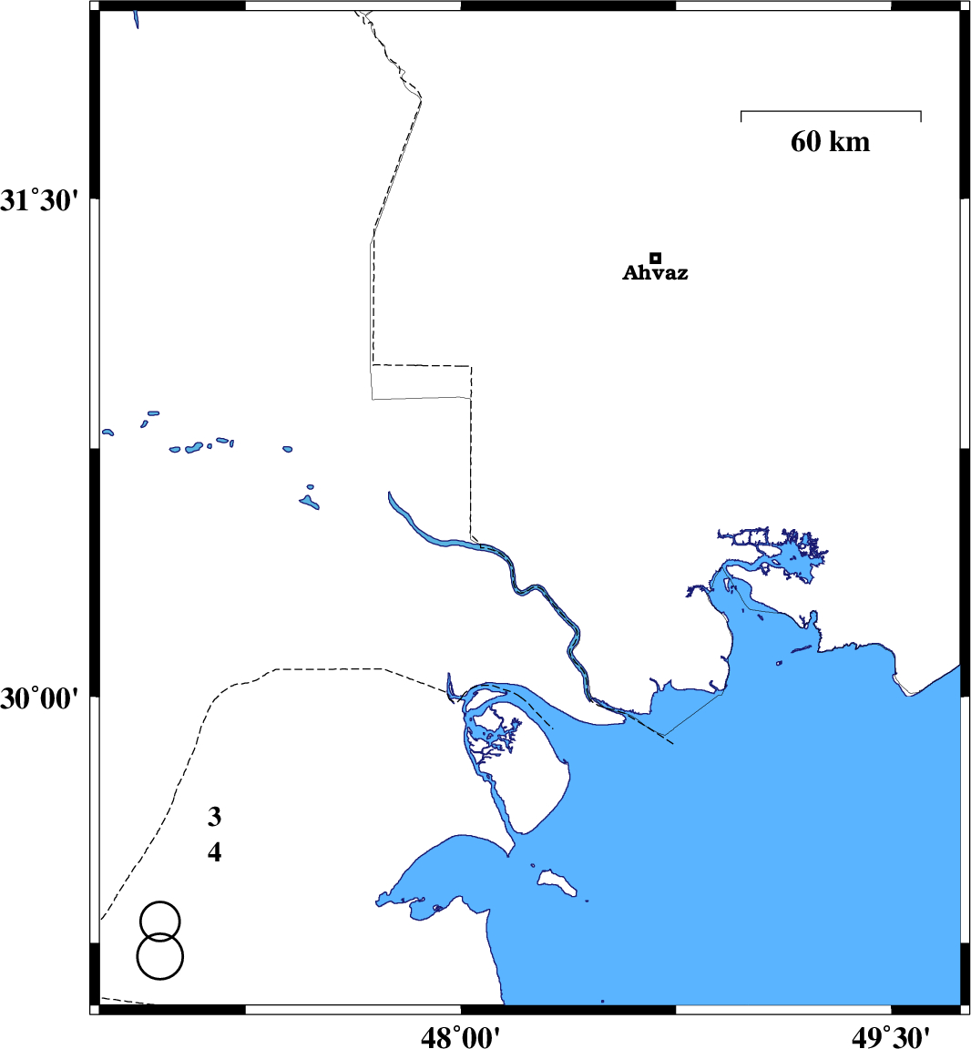 2009/04/22 | 15:16:34.1 | 19:46:34.1 | 30.56 | 48.24 | 15 | ML3.5 | 15 km North of Khorramshahr, Khoozestan Province | ||