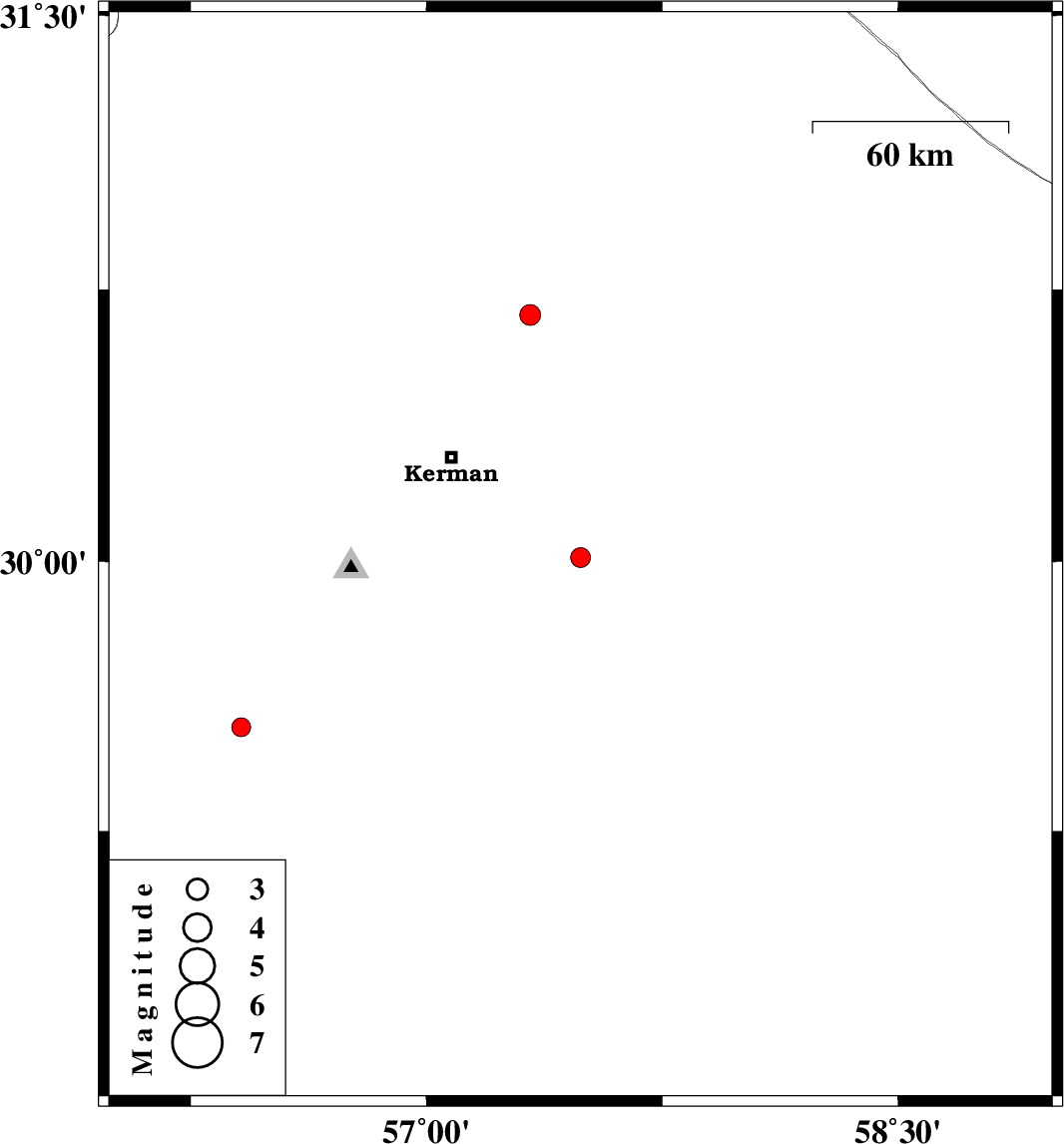 2009/04/24 | 08:56:35.3 | 13:26:35.3 | 30.01 | 57.49 | 8 | ML2.8 | 50 km South-East of Kerman, Kerman Province | ||