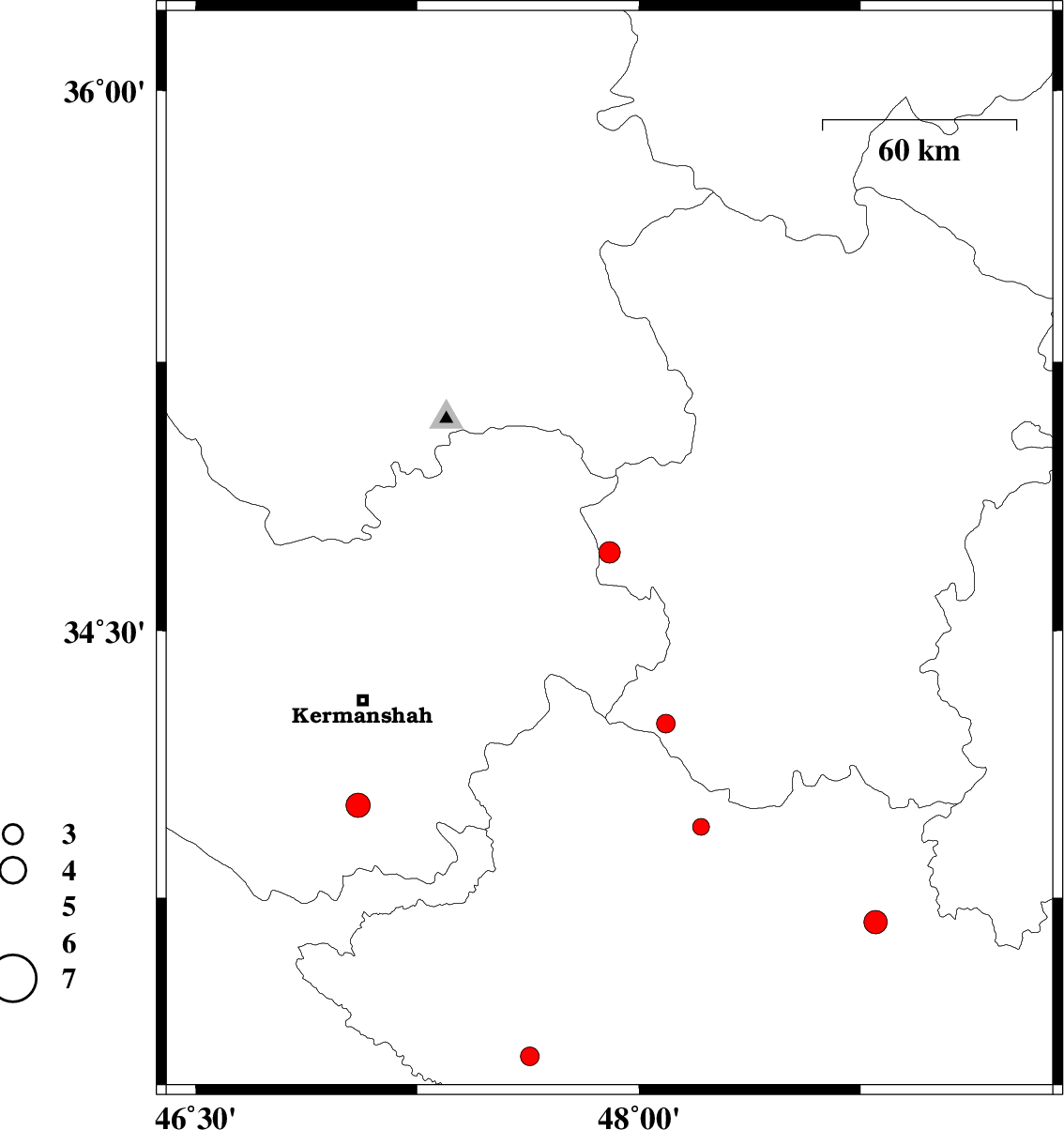 2009/04/08 | 13:36:21.7 | 18:06:21.7 | 34.01 | 47.05 | 18 | ML3.6 | 32 km South of Kermanshah, Kermanshah Province | ||