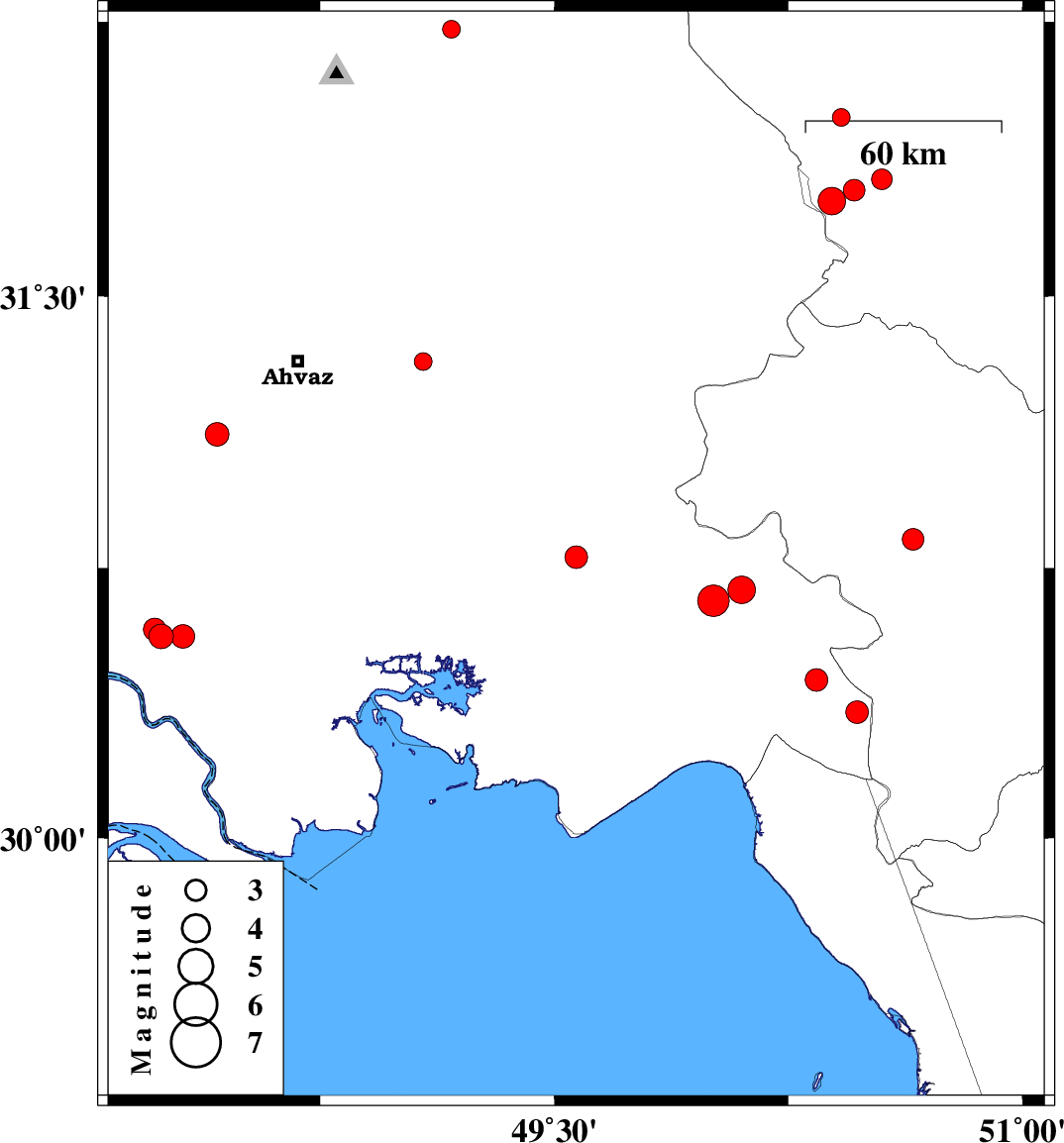 2009/03/31 | 23:11:12.3 | 03:41:12.3 | 30.44 | 50.34 | 37 | ML3.2 | 19 km South-East of Behbahan, Khoozestan Province | ||