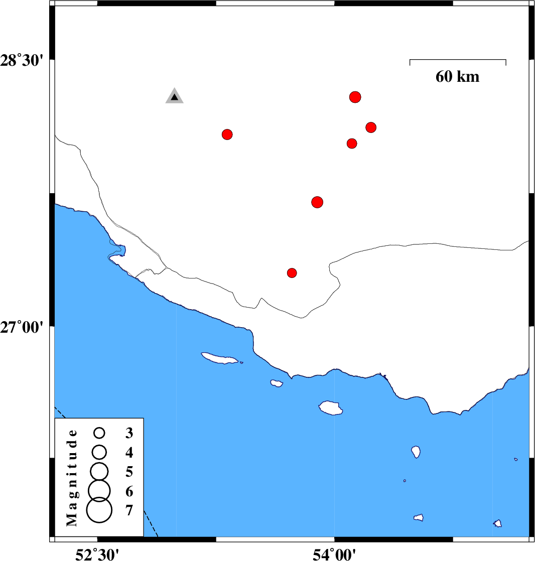 2009/04/21 | 16:47:52.0 | 21:17:52.0 | 28.29 | 54.13 | 15 | ML3.2 | 60 km South-East of Jahrom, Fars Province | ||