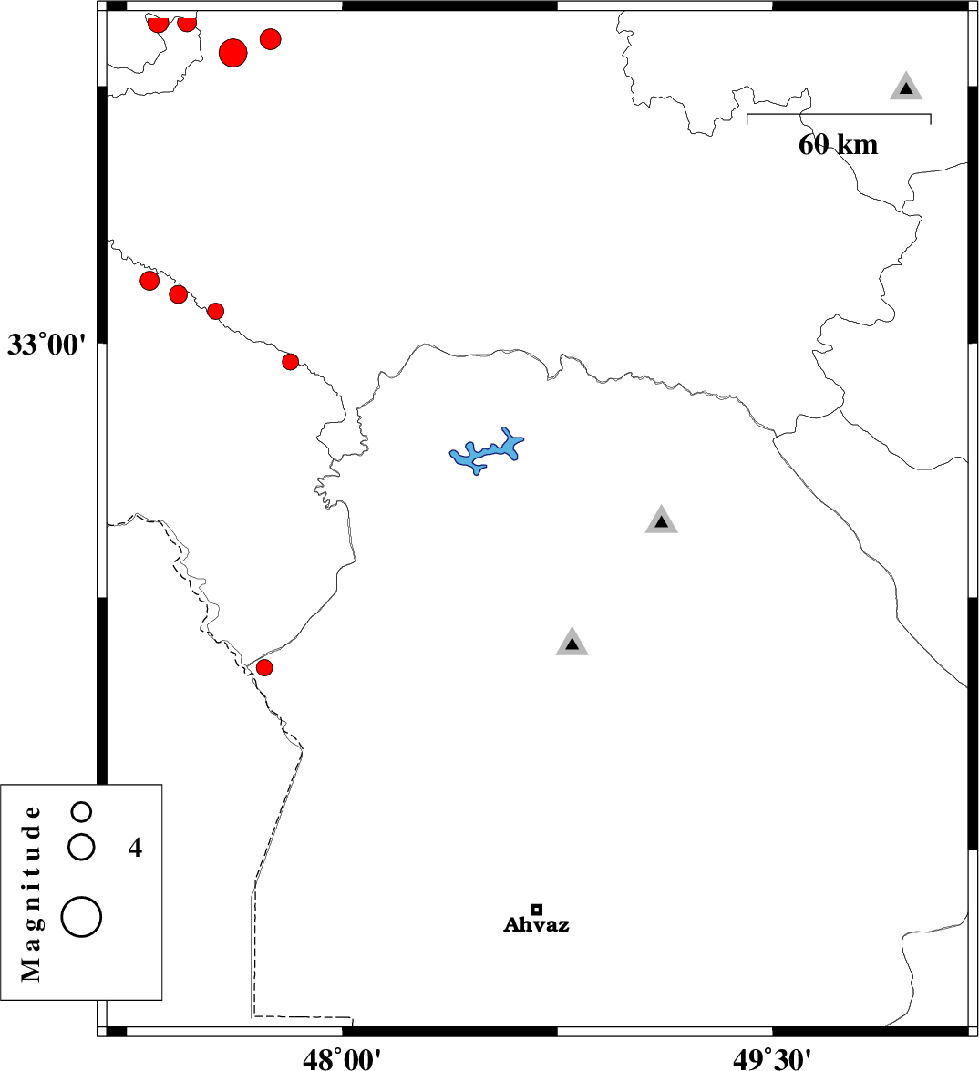 2009/04/07 | 17:32:52.5 | 22:02:52.5 | 32.71 | 48 | 14 | ML4.3 | 43 km North-West of Andimeshk, Khoozestan Province |