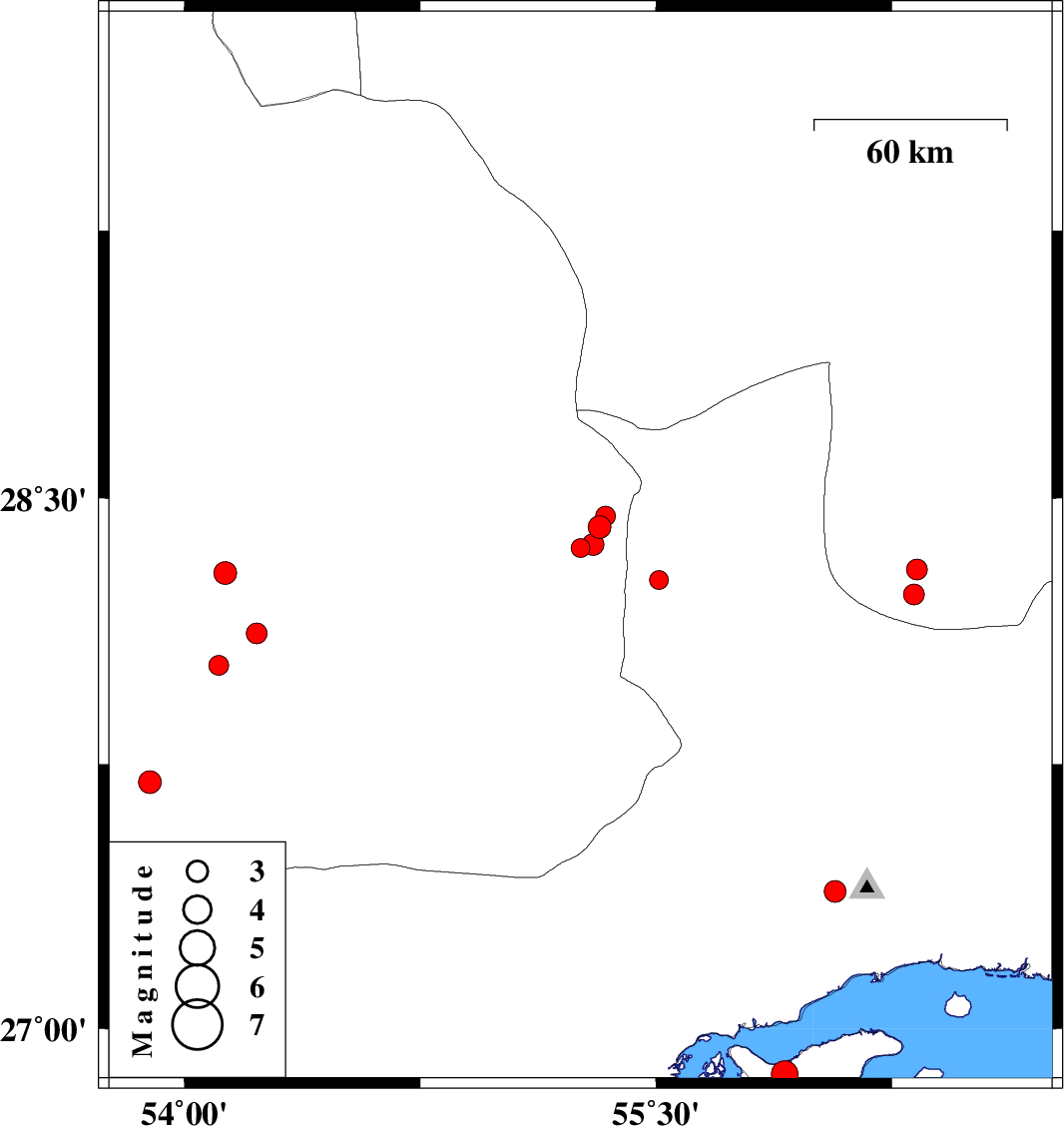 2009/04/14 | 05:10:26.6 | 09:40:26.6 | 26.87 | 55.91 | 8 | ML3.8 | Persian Gulf, 36 km West of Qeshm |