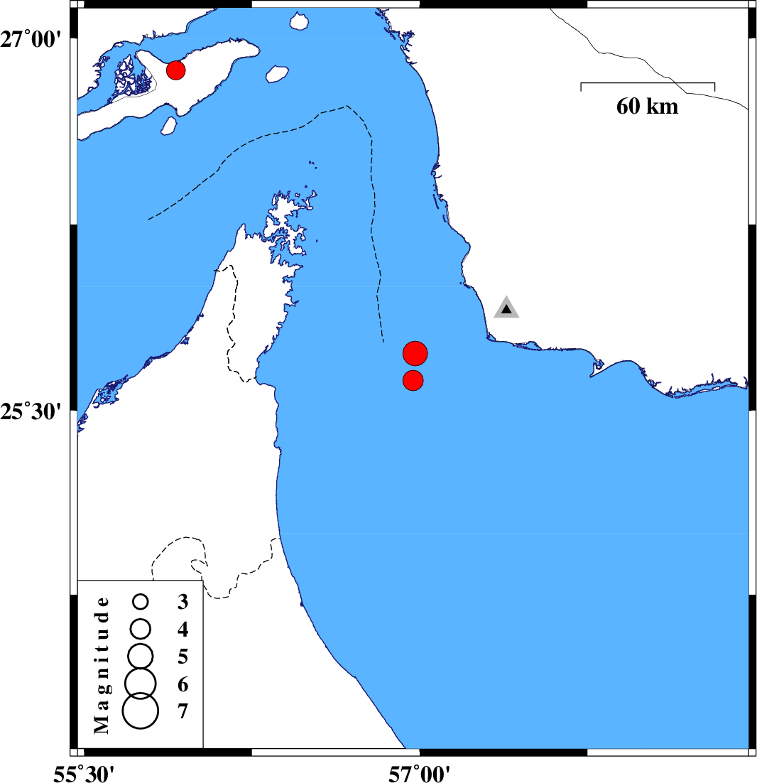 2009/05/07 | 22:44:04.0 | 03:14:04.0 | 25.73 | 56.98 | 14 | ML4.9 | Oman Sea, 80 km West of Jask | ||