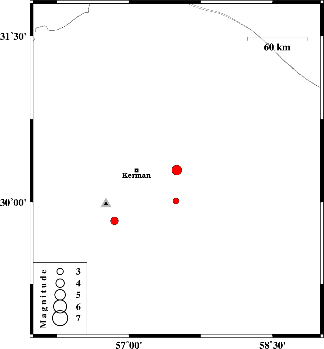 2009/05/11 | 02:14:05.1 | 06:44:05.1 | 30.29 | 57.5 | 18 | ML4.7 | 40 km East of Kerman, Kerman Province | ||