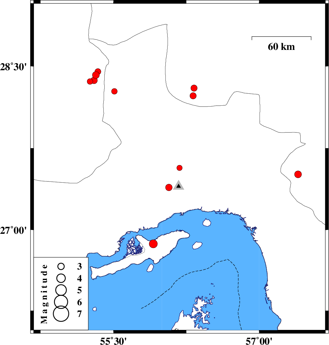 2009/04/14 | 05:10:26.6 | 09:40:26.6 | 26.87 | 55.91 | 8 | ML3.8 | Persian Gulf, 36 km West of Qeshm |