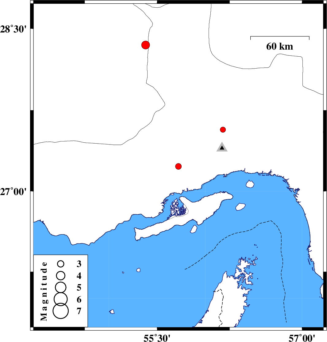 2009/05/12 | 01:19:17.5 | 05:49:17.5 | 27.57 | 56.18 | 14 | ML2.6 | 43 km North-West of Bandar-e abbas, Hormozgan Province |