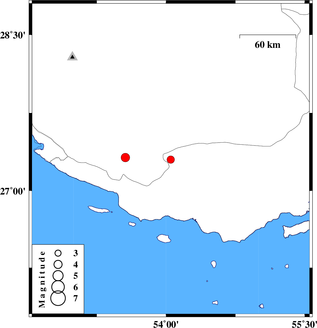 2009/06/02 | 22:34:33.7 | 03:04:33.7 | 27.3 | 54.05 | 46 | ML3.7 | 33 km North-West of Bastak, Hormozgan Province | ||