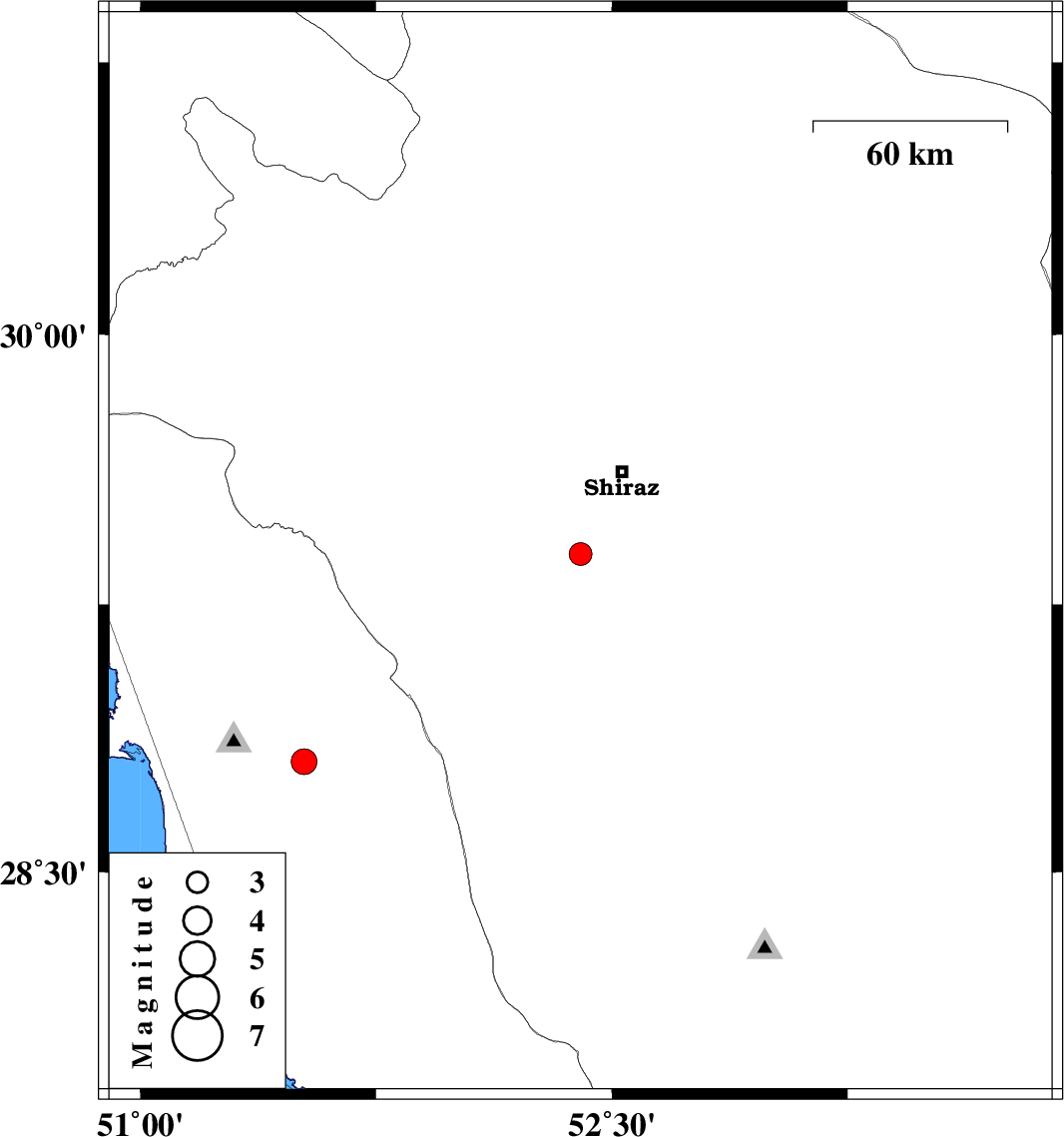 2009/06/09 | 19:32:29.7 | 00:02:29.7 | 29.39 | 52.4 | 15 | ML3.3 | 28 km South-West of Shiraz, Fars Province | ||