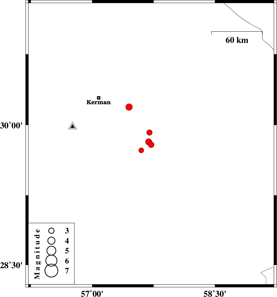 2009/06/05 | 13:20:26.5 | 17:50:26.5 | 29.92 | 57.7 | 14 | ML3.1 | 72 km South-East of Kerman, Kerman Province | ||