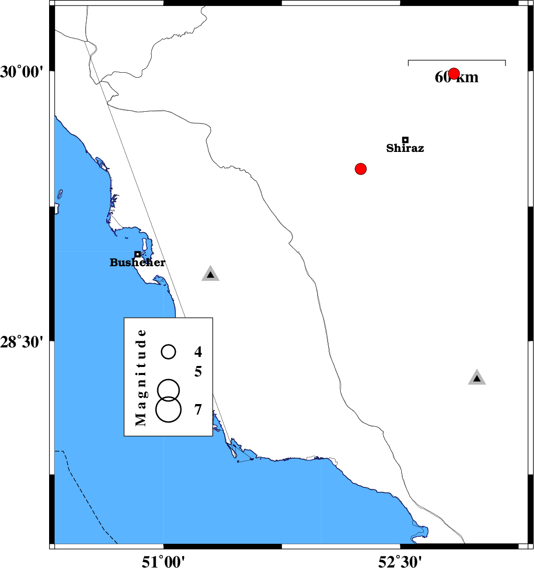 2009/06/09 | 19:32:29.7 | 00:02:29.7 | 29.39 | 52.4 | 15 | ML3.3 | 28 km South-West of Shiraz, Fars Province | ||