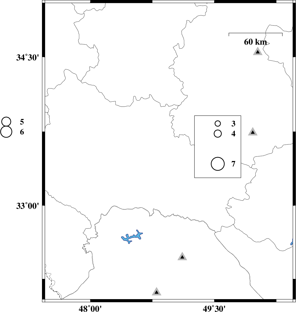 2009/06/13 | 17:12:31.3 | 21:42:31.3 | 33.54 | 48.95 | 15 | ML2.5 | 12 km West of Dorud, Lorestan Province | ||