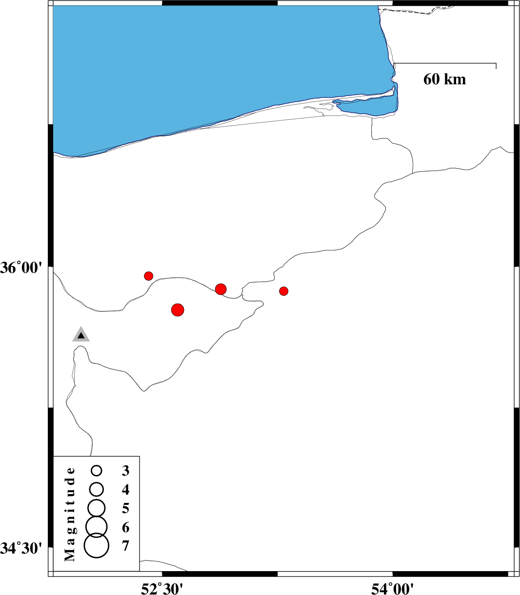 2009/06/15 | 09:07:41.4 | 13:37:41.4 | 35.87 | 53.29 | 14 | ML2.6 | 34 km South-East of Pol-E-Sefid, Mazandaran Province | ||