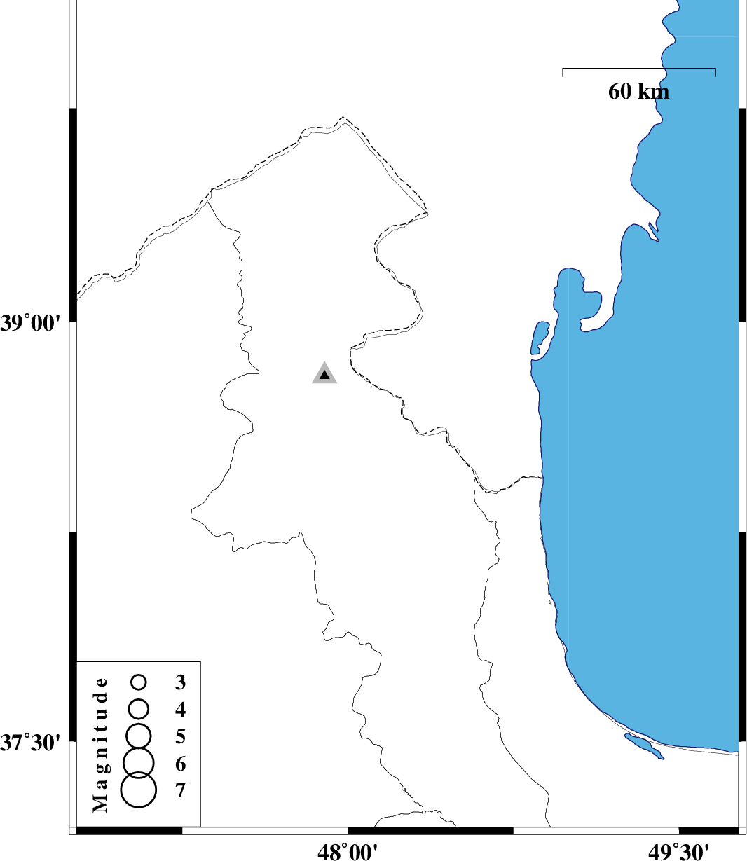 2009/06/16 | 16:21:18.6 | 20:51:18.6 | 38.69 | 48.27 | 15 | ML3.7 | 32 km North-West of Namin, Ardebil Province |