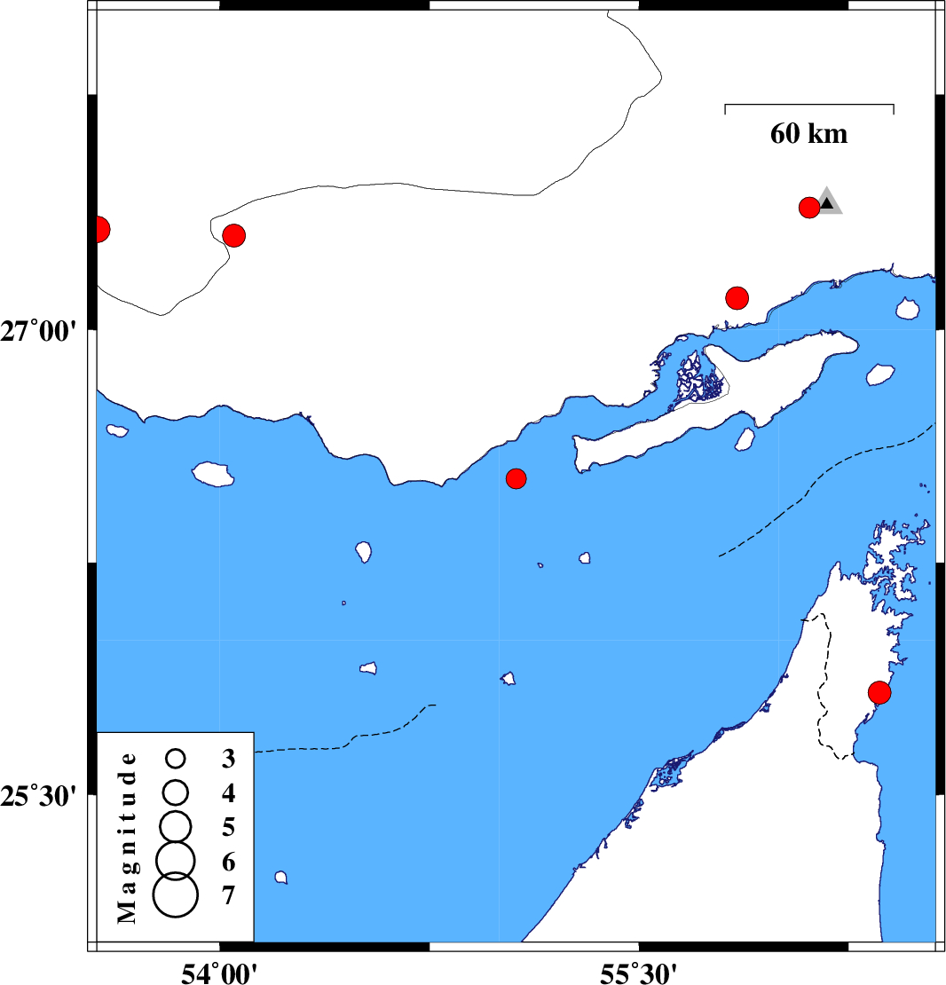 2009/06/02 | 22:34:33.7 | 03:04:33.7 | 27.3 | 54.05 | 46 | ML3.7 | 33 km North-West of Bastak, Hormozgan Province | ||