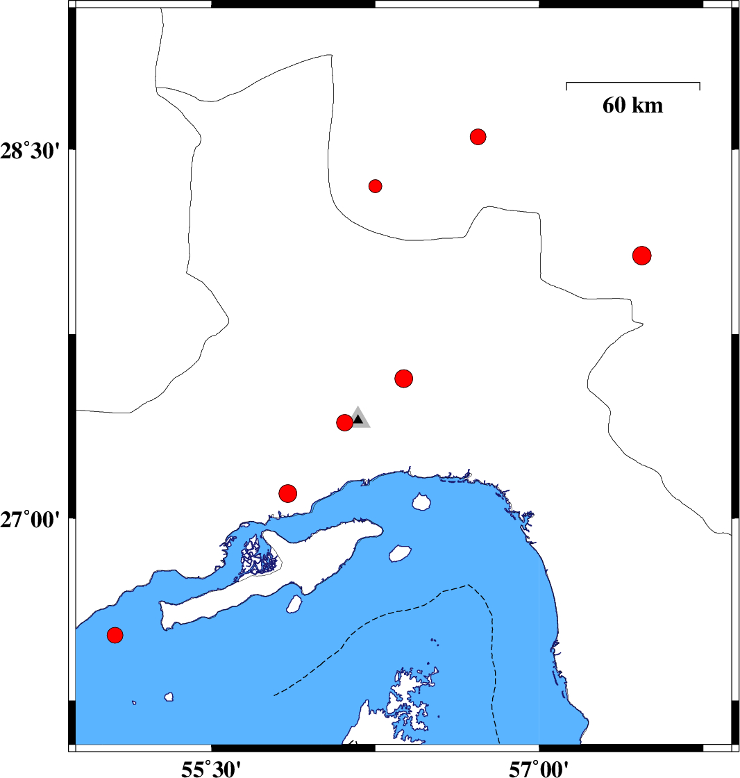 2009/06/19 | 08:16:04.6 | 12:46:04.6 | 27.57 | 56.38 | 14 | ML3.7 | 44 km North of Bandar-e abbas, Hormozgan Province | ||