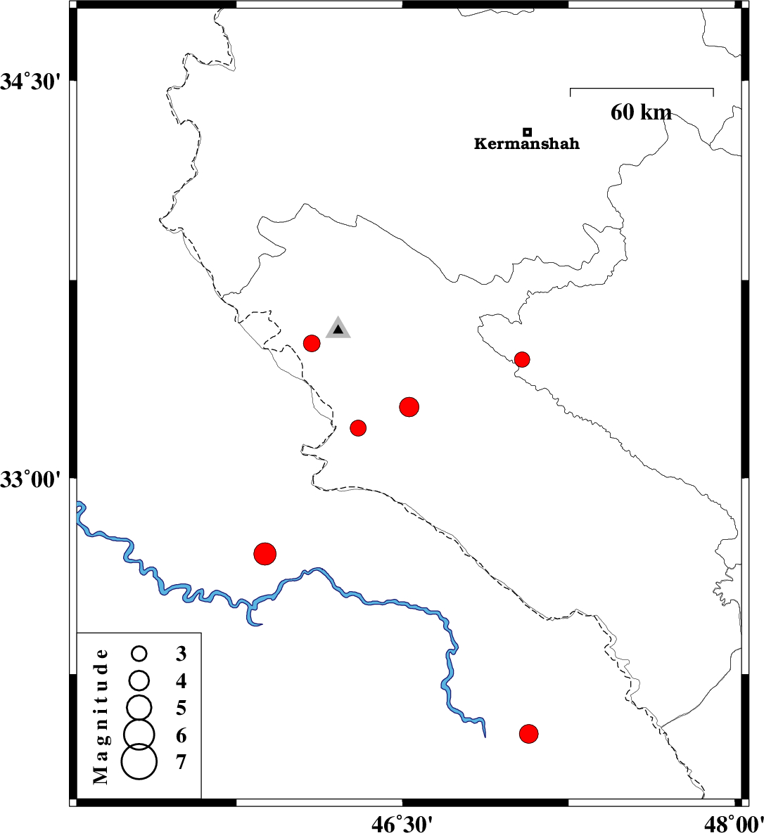 2009/06/25 | 17:08:42.9 | 21:38:42.9 | 33.27 | 46.53 | 14 | ML4 | 37 km North-East of Mehran, Ilam Province | ||