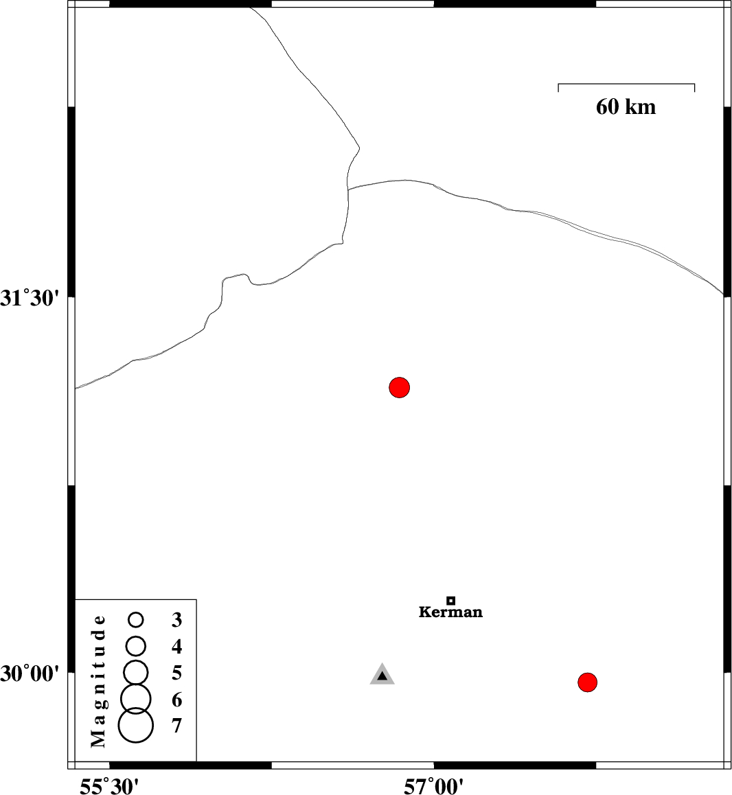 2009/06/26 | 15:49:46.4 | 20:19:46.4 | 31.14 | 56.84 | 15 | ML4.2 | 13 km South of Ravar, Kerman Province | ||