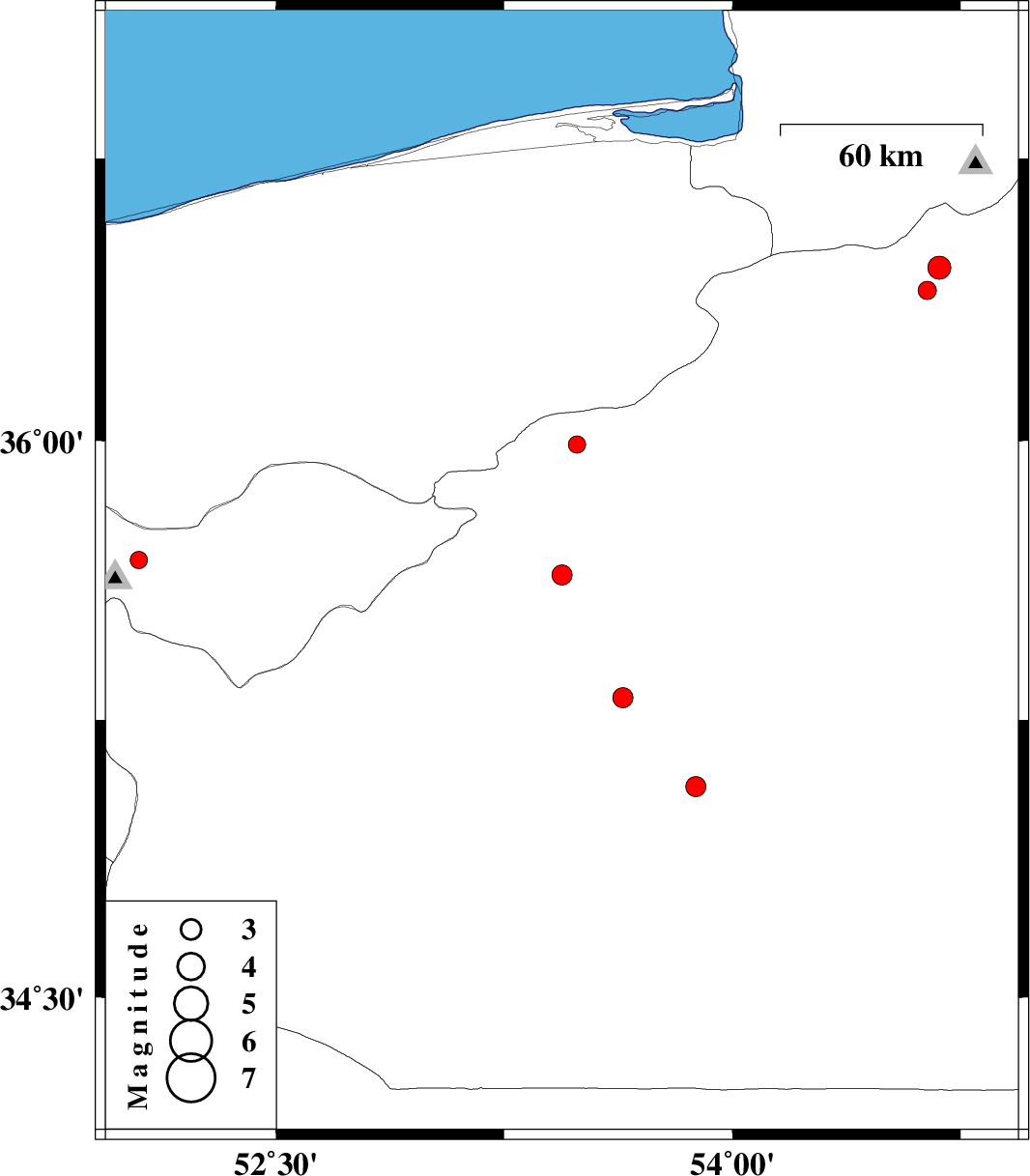 2009/12/19 | 04:10:23.8 | 07:40:23.8 | 36.46 | 54.68 | 18 | ML3.4 | Semnan Province, 26 km West of Shahrud | ||