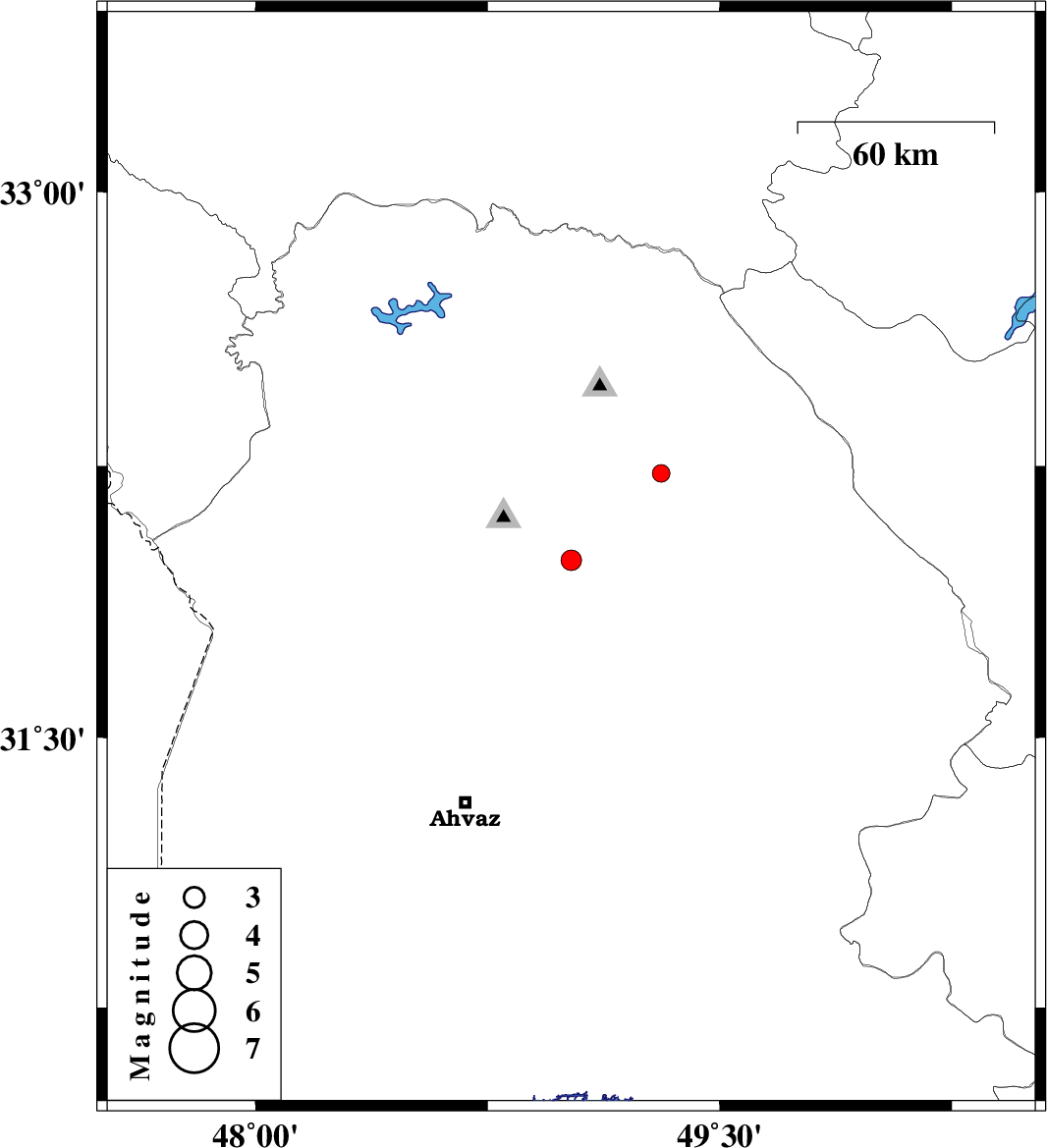 2010/01/04 | 17:37:06.2 | 21:07:06.2 | 31.99 | 49.02 | 14 | ML3 | 16 km East of Shushtar, Khoozestan Province | ||