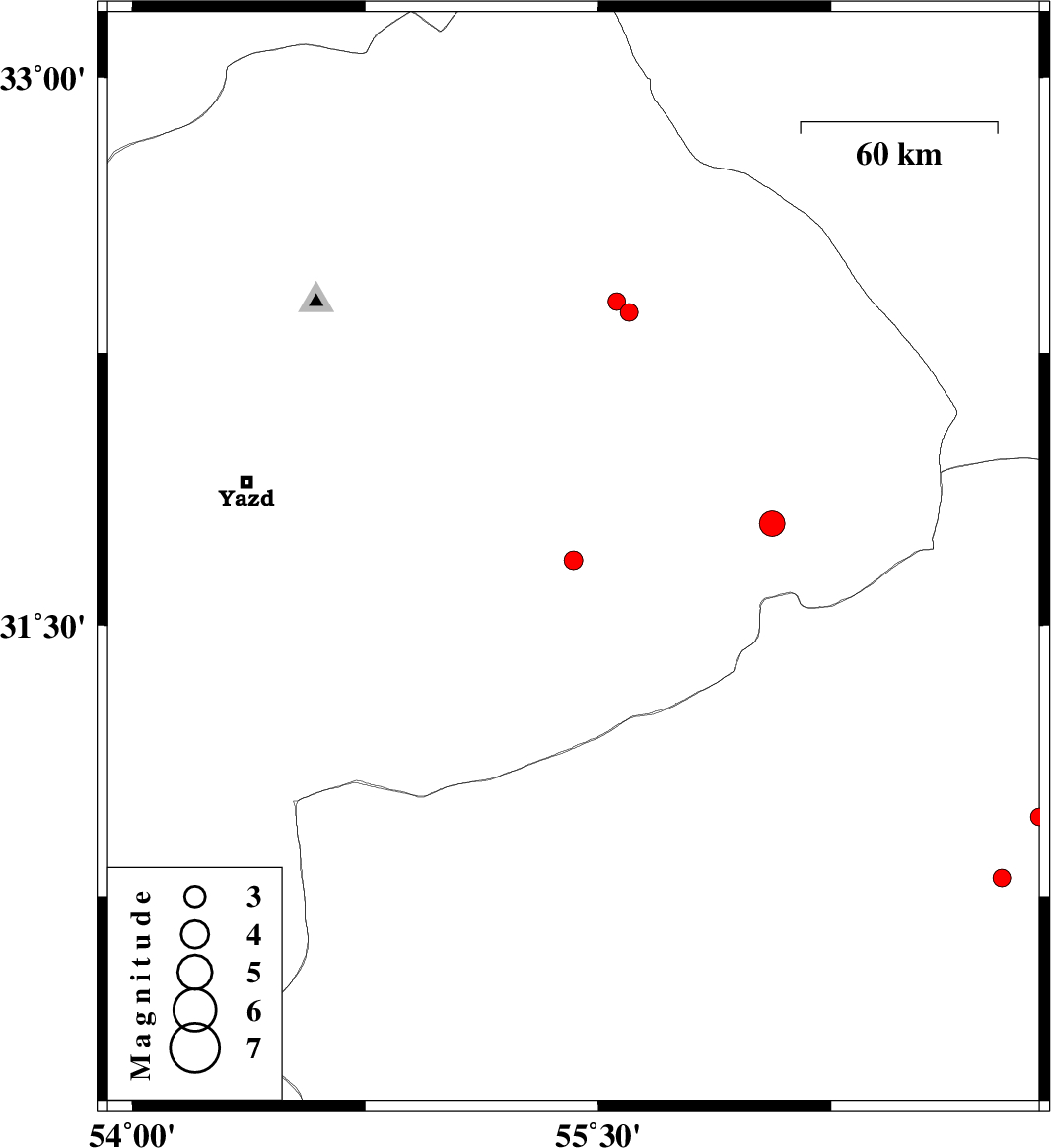 2009/12/28 | 09:53:34.5 | 13:23:34.5 | 32.36 | 55.6 | 14 | ML:2.5 | Yazd Province, 86 km North-East of Bafq | ||