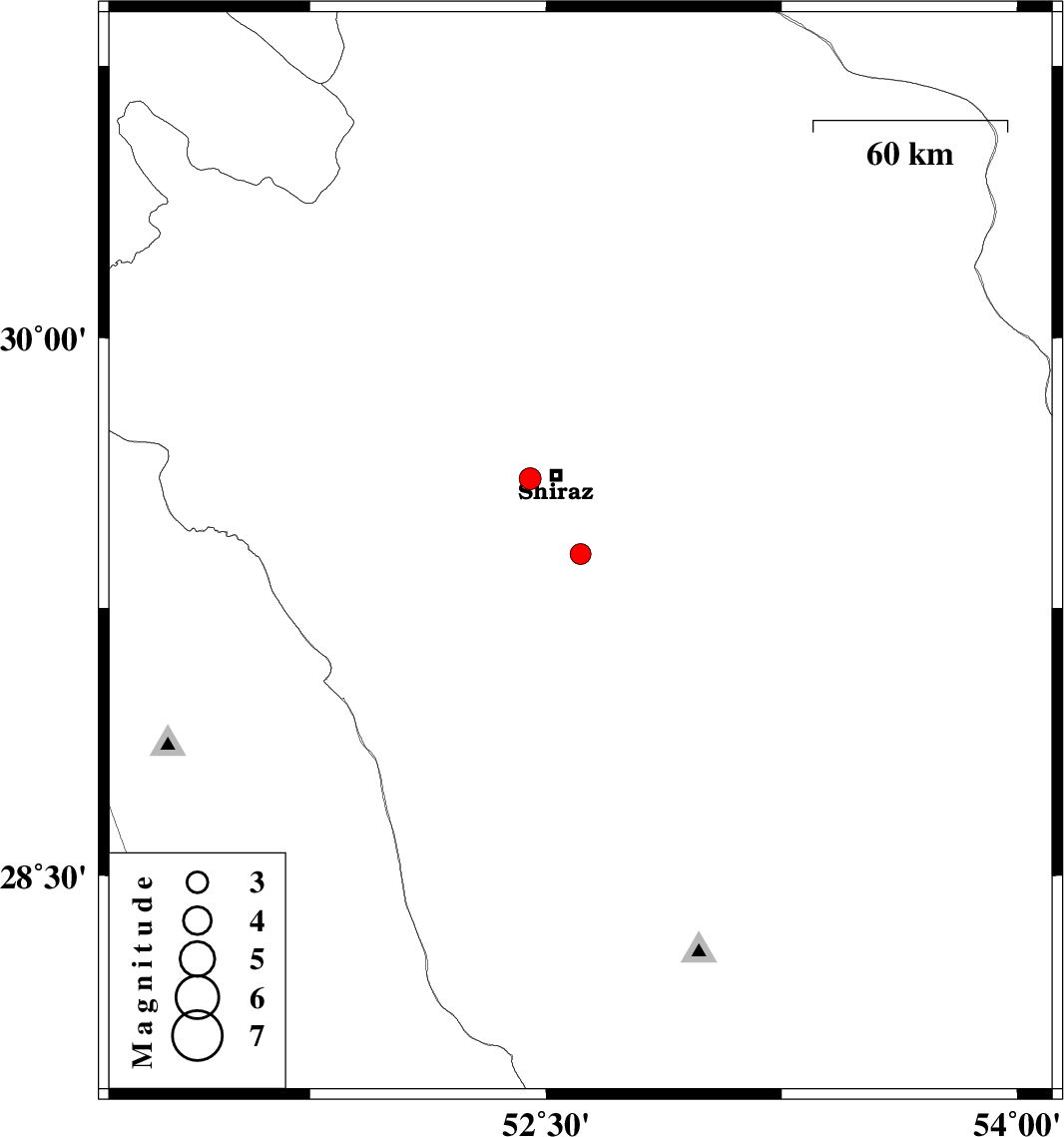 2010/01/08 | 02:28:18.5 | 05:58:18.5 | 29.4 | 52.61 | 46 | ML:3 | 25 km South of Shiraz, Fars Province | ||
