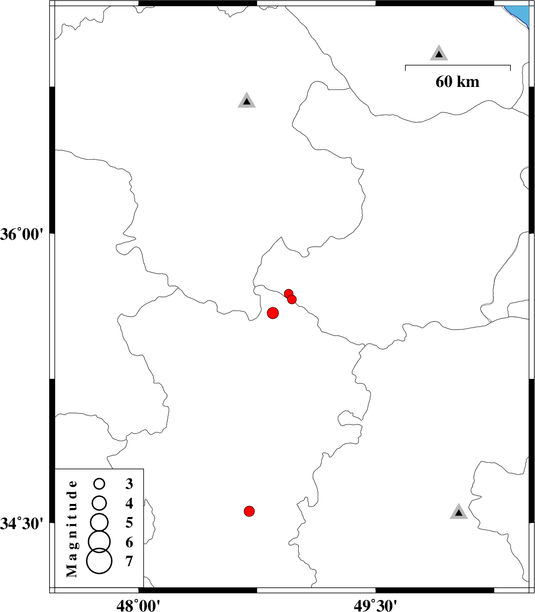 2010/01/08 | 00:41:29.0 | 04:11:29.0 | 35.69 | 48.95 | 28 | ML2.6 | 34 km North of Razan, Hamedan Province | ||