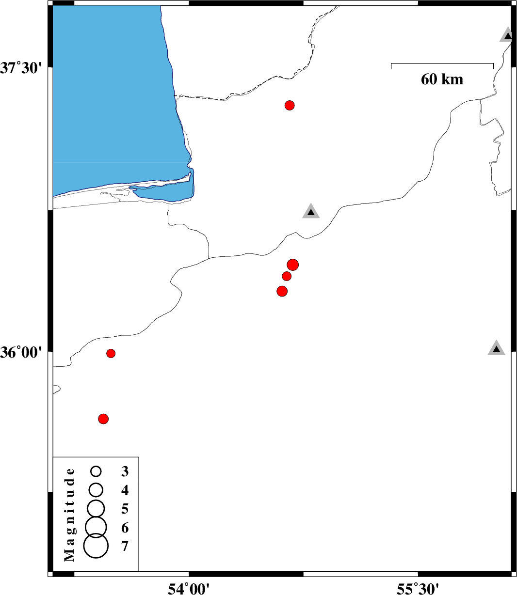 2009/12/19 | 04:10:23.8 | 07:40:23.8 | 36.46 | 54.68 | 18 | ML3.4 | Semnan Province, 26 km West of Shahrud | ||
